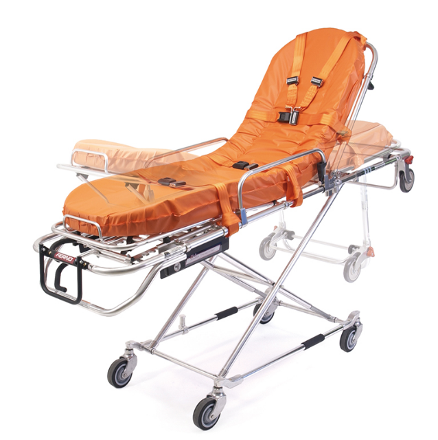 救护车中使用的急救担架带有轮子,可以更轻松地在人行道上运输,并且在救护车内设有锁,在运输过程中用带子固定病人。担架上的一个整体凸耳锁定在救护车内的弹性闩锁中,以防止在运输过程中移动。现代担架也可能有电池供电的液压系统来自动抬高和折叠腿,这减轻了急救人员的工作量,据统计,他们由于重复抬放病人而有很高的背部损伤风险。还有为肥胖患者提供的担架,其具有更宽的框架和更高的承重能力,适合较重的患者。担架通常用一次性床单或包裹物覆盖,并在每次使用后清洁以防止感染传播。医疗设备和静脉注射药物的架子、挂钩和杆也经常包括在内。